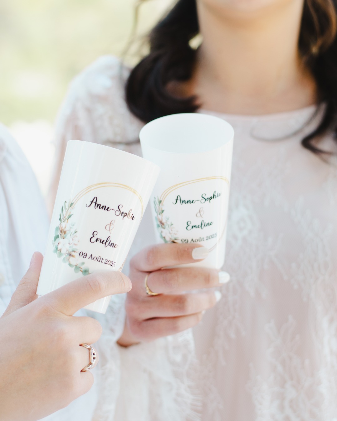 L’idée est simple, et c’est ce qu’on aime. Au lieu d’un verre jetable sans âme, chaque invité reçoit un gobelet à votre image. Vos prénoms, la date, une citation qui vous tient à cœur, un visuel qui reprend l’univers de vos faire-part… Le gobelet devient une pièce à part entière de votre décoration, et un souvenir que vos invités garderont bien au-delà du lendemain matin.