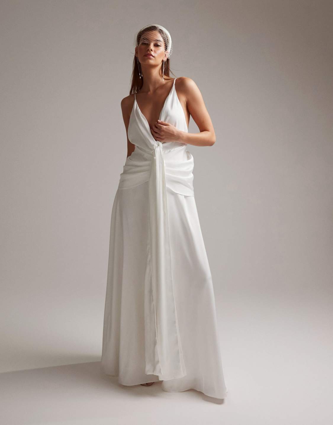 ASOS DESIGN – Emily – Robe de mariée en satin drapé à bretelles fines et décolleté plongeant