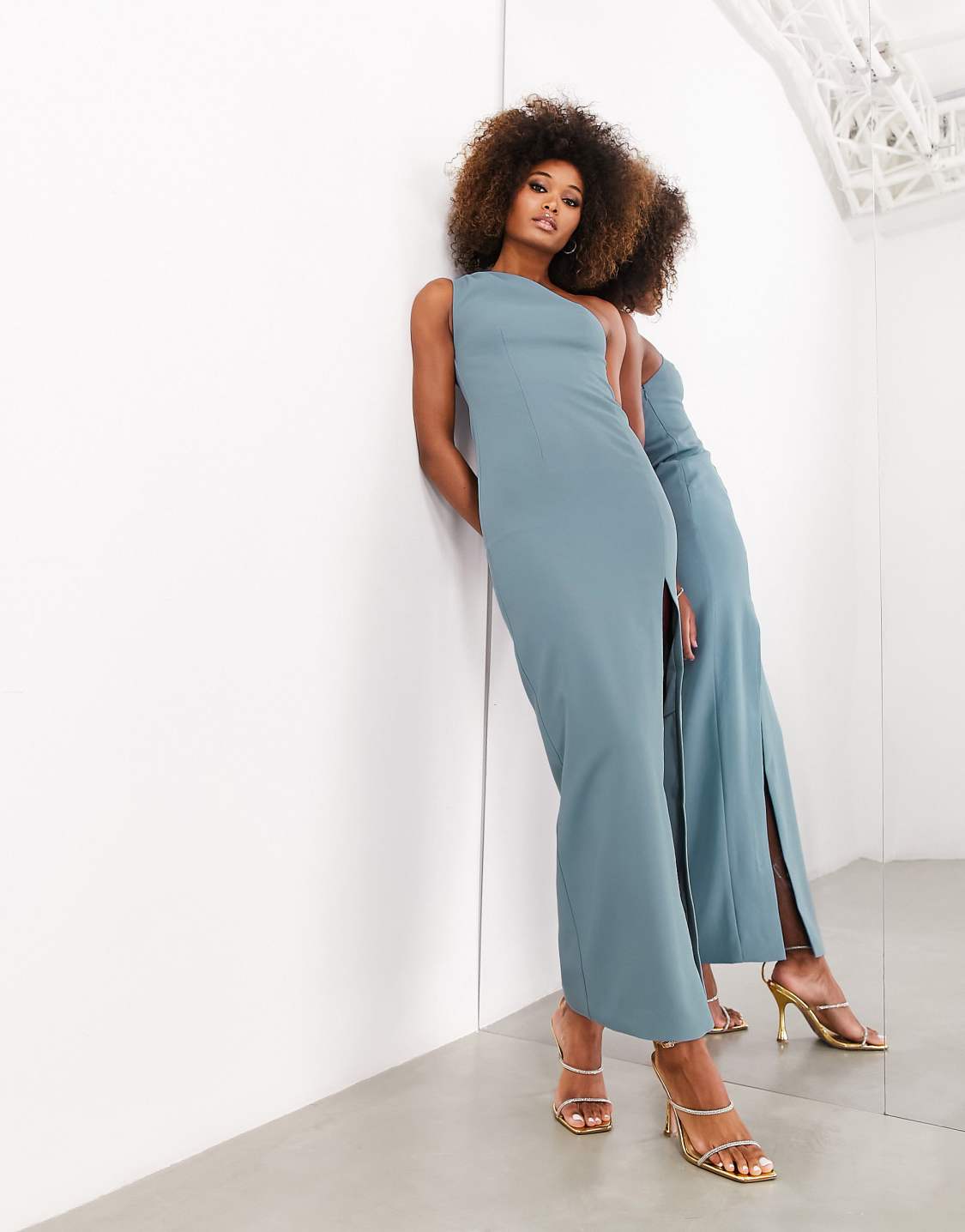 ASOS DESIGN – L’invitée – Robe colonne longue asymétrique en crêpe avec fente – Bleu cendré