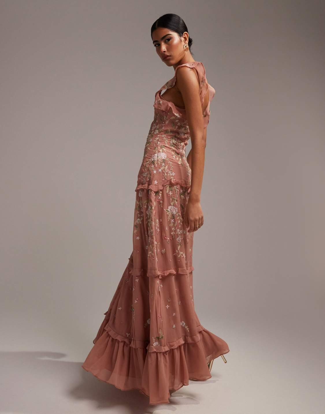 ASOS DESIGN – Robe longue ornementée de demoiselle d’honneur à bretelles fines et broderies – Rose