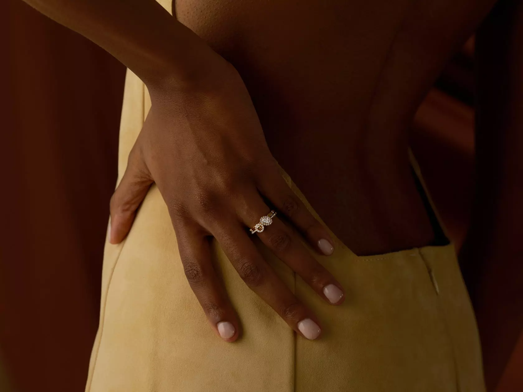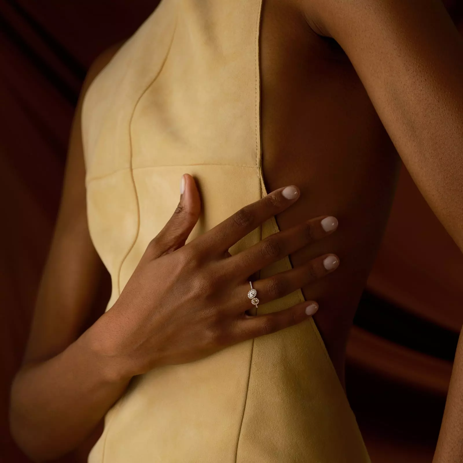Ce design, orné d'un diamant taille ovale, offre une interprétation nouvelle, axée sur la personnalisation : vous pourrez choisir la pierre taille rond qui ornera votre bijou parmi une large sélection. Parfaitement proportionné, le corps semi-pavé de la bague s’effile à l’approche du motif. Finement pincé, il combine légèreté et solidité grâce à une base élargie. Conçu pour mettre en valeur les deux pierres centrales et leur entourage en micro-serti, ce modèle se distingue par un chaton légèrement surélevé, idéal pour le porté en accumulation ou assorti à nos alliances. Chaque détail a été minutieusement pensé : l’entourage pavé épouse parfaitement la forme des pierres, sans aucun jour, afin de magnifier leur éclat.