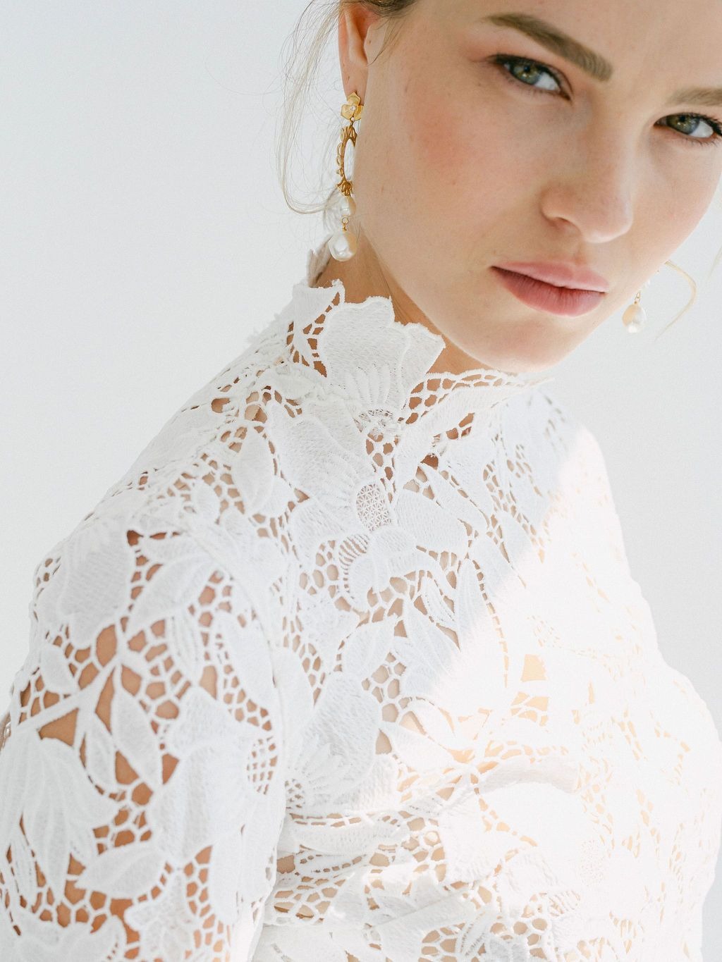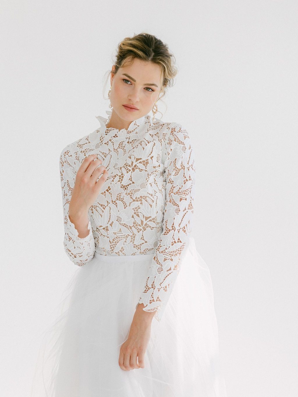 Robe de mariée col montant mi-longue en guipure et tutu